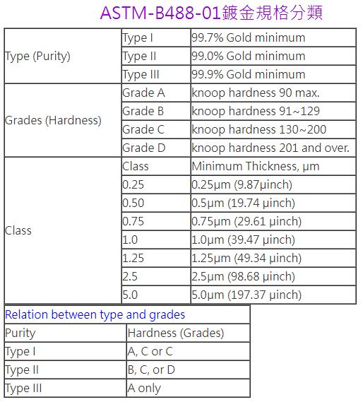 因為一時看不懂,所以翻閱了一些資料,終于發(fā)現(xiàn)這個規(guī)格原來是規(guī)定鍍金的純度(Type 3, 金的含量99.9%以上 )與硬度等級(Grade A, 努普硬度90以上)。