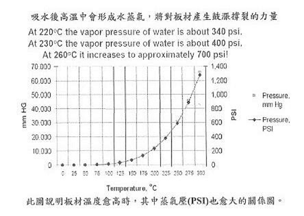 樹脂吸水較多時Tg值會下降(△Tg應該小于5°C)且橡膠態(tài)會提早到來,將引發(fā)板材Z方向瞬間腫脹(Swelling)而快速開裂(100°C~Tg溫度之間最容易發(fā)生),水蒸氣超過100°C后的氣壓(psi)將成等比級數(shù)增加(見下圖)。