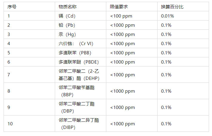 2015年6月4日,歐盟官方公報(OJ)發(fā)布RoHS2.0修訂指令(EU)2015/863,正式將DEHP、BBP、DBP、DIBP列入附錄II 限制物質(zhì)清單中,至此附錄II共有十項(xiàng)強(qiáng)制管控物質(zhì)。
