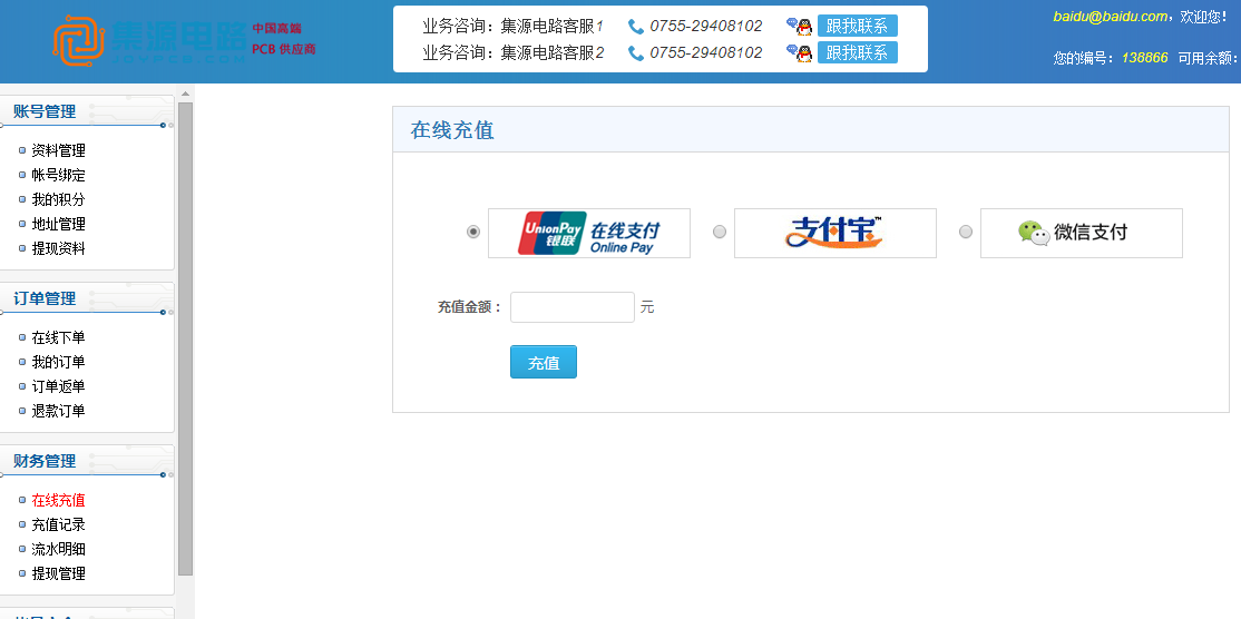 余額支付是集源電路提供的一種在線充值到本賬戶并使用的支付方式。在線充值流程如下